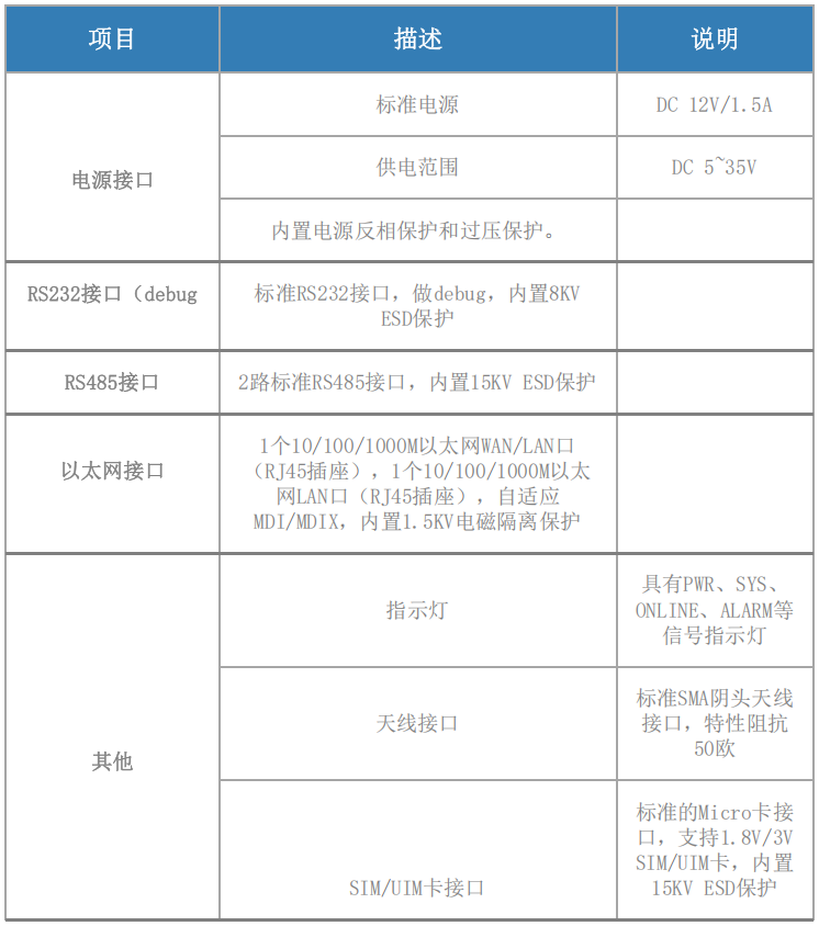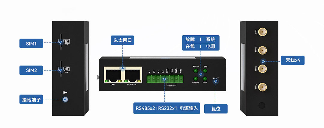 雙SIM卡(標(biāo)準(zhǔn)的Micro卡接口,支持1.8V/3V SIM/UIM卡),4*5G天線,1×LAN、1×WLAN/LAN、1×RS232(debug)、2×RS485。