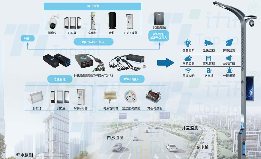 5G智慧燈桿專用網(wǎng)關(guān)TG473系列豐富的應(yīng)用、通信接口,強(qiáng)大的協(xié)議轉(zhuǎn)換能力,配合智慧終端設(shè)備管理平臺系統(tǒng)工作,構(gòu)建具備智能感知、無線遠(yuǎn)傳、智能照明、視頻監(jiān)控、5G基站、智能充電樁、環(huán)境氣象監(jiān)測等能力的5G智慧燈桿物聯(lián)網(wǎng)系統(tǒng)。