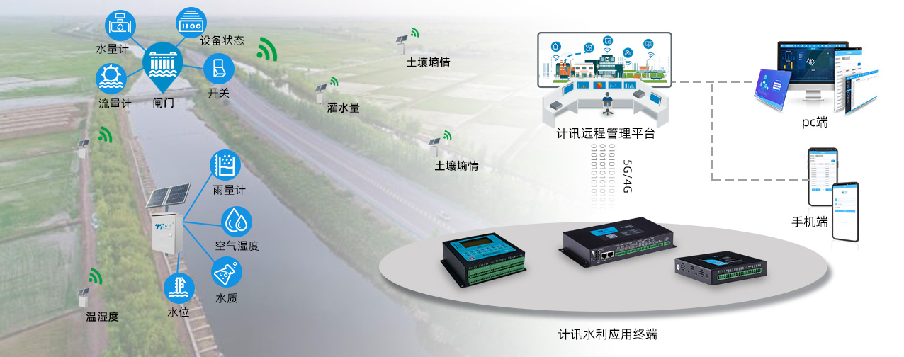 遙測終端機(jī)作為核心建立通信通道,下行對接監(jiān)測點各類傳感器、控制終端、視頻圖像終端,模擬量、開關(guān)信號量、視頻圖像實時采集,存儲、分析、處理,計訊物聯(lián)水利遙測終端機(jī)運用全網(wǎng)通5G/4G、北斗、GPRS等上傳服務(wù)器。上行對接控制中心,數(shù)據(jù)展示,傳力研判,可視化圖表準(zhǔn)確趨勢預(yù)判,監(jiān)測點狀態(tài)24小時實時監(jiān)控,精準(zhǔn)掌握水情、雨情、灌溉工況、土壤墑情、氣象環(huán)境等綜合情況,設(shè)備遠(yuǎn)程控制、配置、運維,以達(dá)到科學(xué)種植、灌區(qū)信息化管理的終極目標(biāo)。