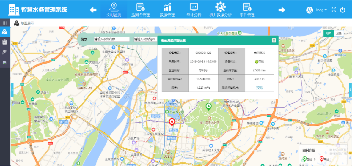 基于GIS地圖展現(xiàn)各監(jiān)測(cè)點(diǎn)空間分布情況、監(jiān)測(cè)點(diǎn)狀態(tài)、實(shí)時(shí)數(shù)據(jù),不同狀態(tài)的監(jiān)測(cè)點(diǎn)不同顏色標(biāo)注,實(shí)時(shí)播報(bào)告警信息。