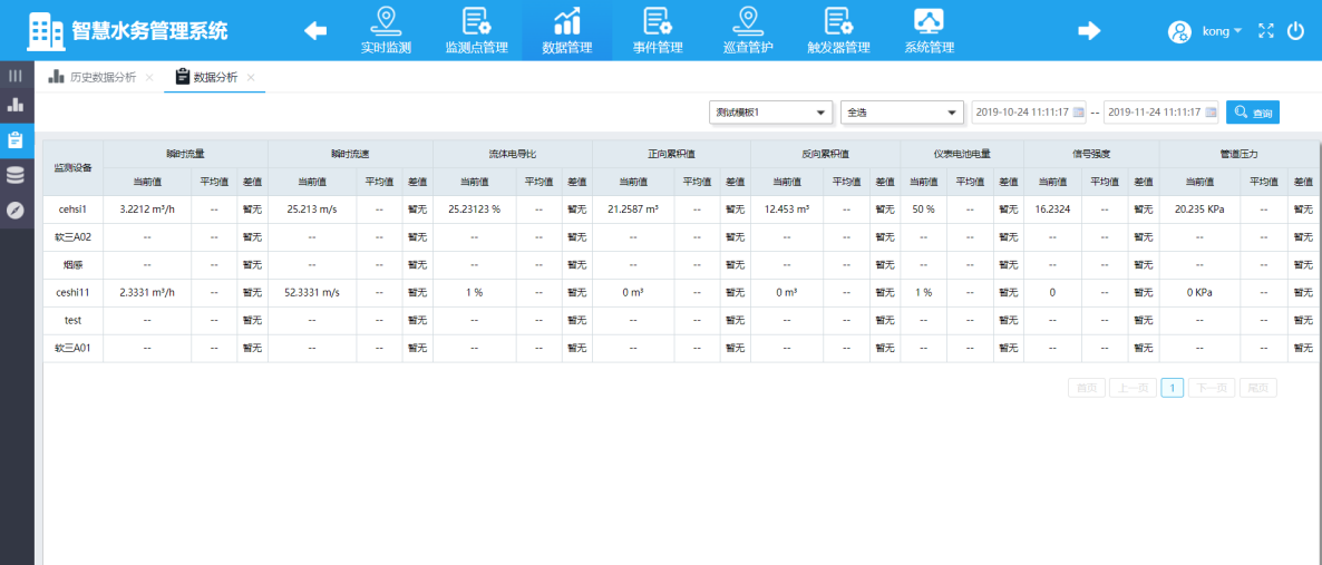 實(shí)時(shí)展現(xiàn)監(jiān)測(cè)點(diǎn)所采集瞬時(shí)流量、壓力、PH值、濁度、閥門狀態(tài)等數(shù)據(jù)信息。