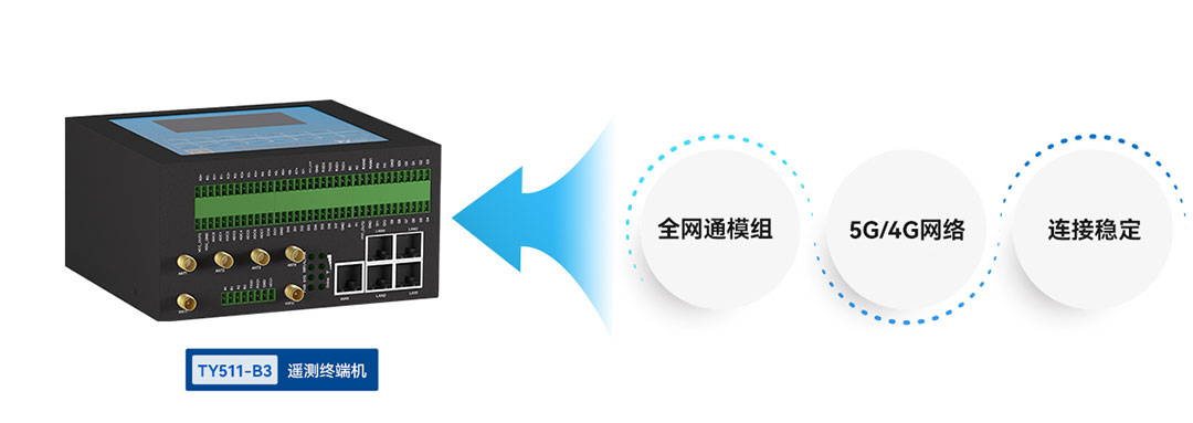 遙測(cè)終端RTU TY511-B3,全網(wǎng)通5G/4G、北斗通信,具備網(wǎng)口、模擬量輸入、開關(guān)量、多路RS232和RS485接口,集數(shù)據(jù)采集、傳輸、控制功能于一體的工業(yè)級(jí)遠(yuǎn)程測(cè)控終端,支持國(guó)家水文/水資源規(guī)約/HJ212、Json、Modbus TCP/Modbus RTU、MQTT協(xié)議等。