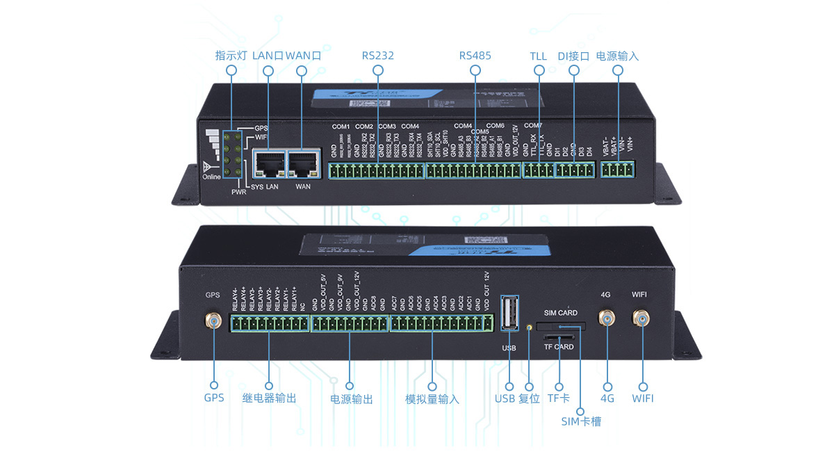 支持3個RS232接口、3個RS485接口、1個I2C接口、1個TTL電平串口、4路開關(guān)量輸入接口、8路模擬量輸入接口(12位AD、支持4-20mA電流或0-5V電壓信號)、4路繼電器輸出、5路電源輸出(外設(shè)供電)等可兼容采集多種水利傳感器采集需求;支持WAN/LAN、ADSL、GPRS、4G、WIFI等滿足不同環(huán)境下對遠(yuǎn)程通信的需求。
