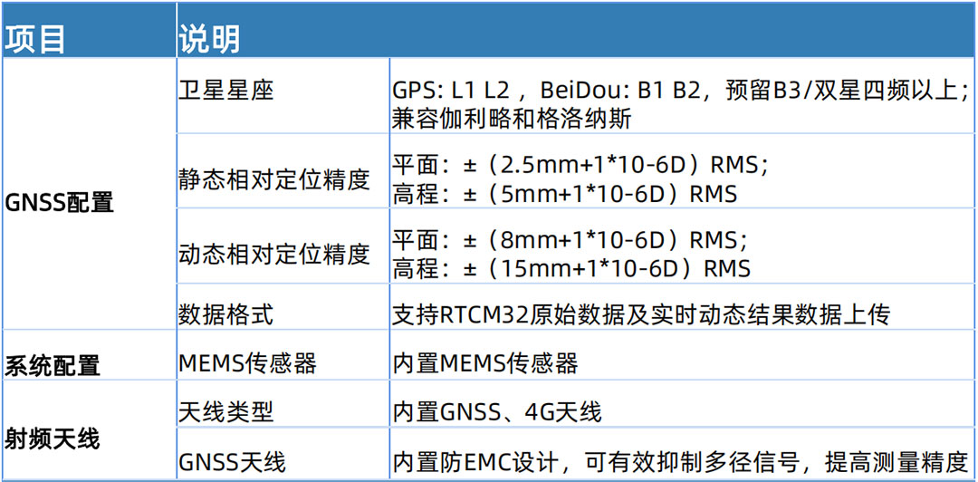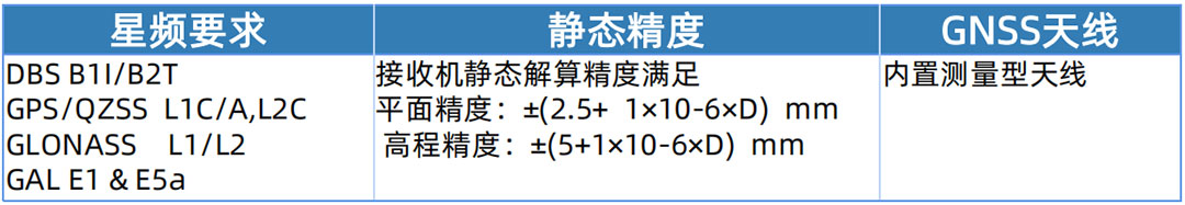 靜態(tài)相對(duì)定位精度:平面±(2.5mm+1*10-6D)RMS,高程±(5mm+1*10-6D)RMS;
