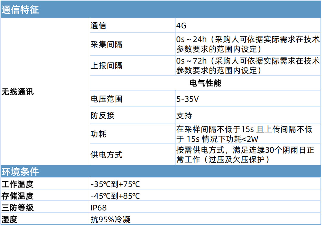 在采樣間隔不低于 15s 且上傳間隔不低于 15s 情況下功耗<2W。按需供電方式,滿足連續(xù)30個陰雨日正常工作(過壓及欠壓保護(hù))。