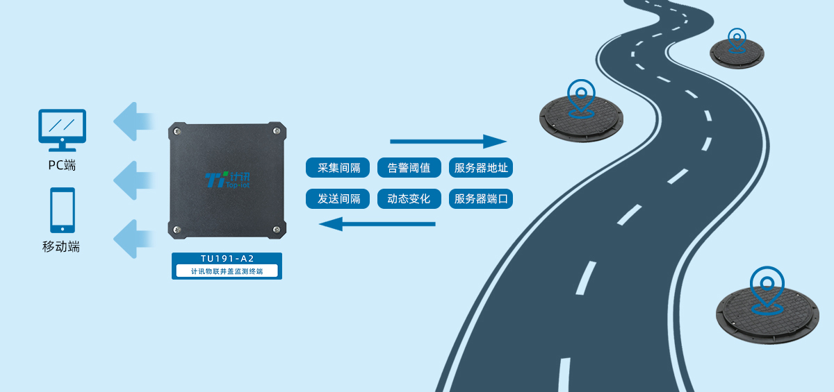 計訊物聯(lián)井蓋監(jiān)測終端TU191-A2支持?jǐn)?shù)據(jù)采集與無線上云,并通過井蓋監(jiān)測管理系統(tǒng)實現(xiàn)井蓋異動(移動、傾斜),井蓋低電、液位超限等狀態(tài)監(jiān)測,井蓋自動找平,數(shù)據(jù)異常及時定位告警,工作人員電腦端、手機(jī)端多方式第一時間接收異常設(shè)備信息進(jìn)行檢修維護(hù),避免造成人身安全隱患及財產(chǎn)損失。