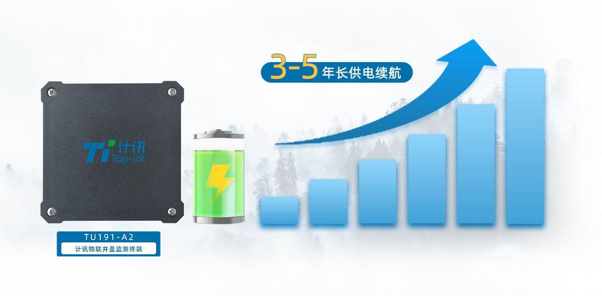 3.6V 4AH鋰電池供電,無需外部電源,適用于井下環(huán)境使用,此外設(shè)備采用超低功耗設(shè)計,保證井蓋監(jiān)測終端TU191-A2的3-5 年長供電續(xù)航,持久耐用壽命更長。