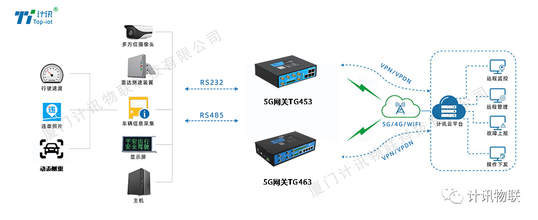 計訊物聯(lián)科技治超解決方案將大數(shù)據(jù)、5G、傳感、云計算、人工智能等高新技術(shù)集于計訊物聯(lián)5G工業(yè)網(wǎng)關(guān),并支持多方位攝像頭、動態(tài)測重器、雷達(dá)測速裝置、外廓尺寸、LED顯示屏、廣播、報警等設(shè)備的接入,實現(xiàn)動態(tài)稱重、車輛長寬高監(jiān)測、抓拍識別、語音提示、超限車輛LED顯示、視頻監(jiān)控等功能。當(dāng)數(shù)據(jù)采集后,計訊物聯(lián)5G工業(yè)網(wǎng)關(guān)可借助5G移動網(wǎng)絡(luò)將稱重時間、車輛牌號、車牌照片、地點、車道、方向、總重量、超限額度等采集數(shù)據(jù)傳輸至計訊物聯(lián)云平臺。