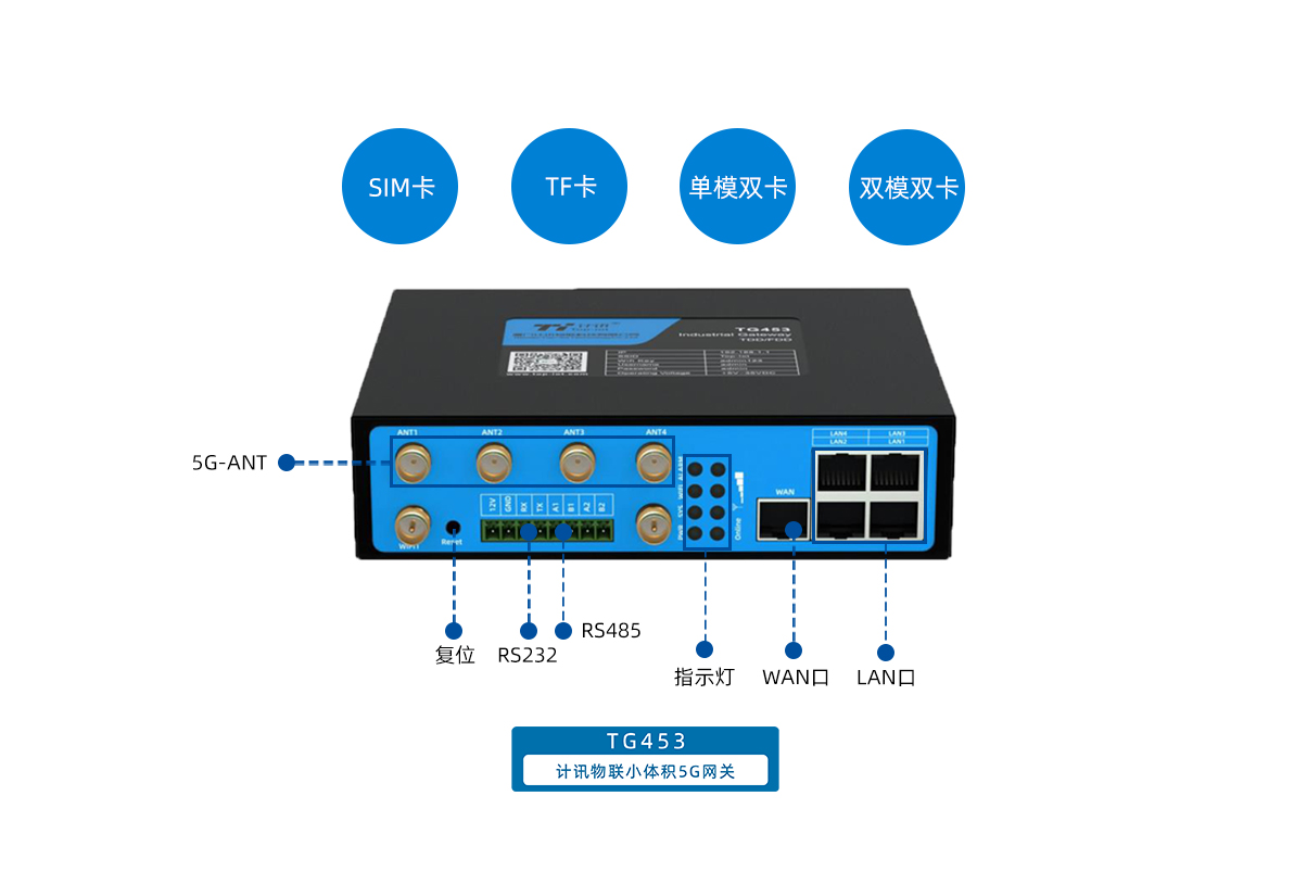 計(jì)訊物聯(lián)TG453小體積5G網(wǎng)關(guān)支持4路LAN、1路WLAN、1路RS232(debug)、2路RS485、支持SIM卡、TF卡、2.4G Wifi功能、具有單模雙卡(可選)、雙模雙卡(可選)??赏瑫r(shí)接入多個(gè)串口設(shè)備、網(wǎng)口設(shè)備和WiFi設(shè)備。為智慧應(yīng)用場景提供高速運(yùn)載支撐。