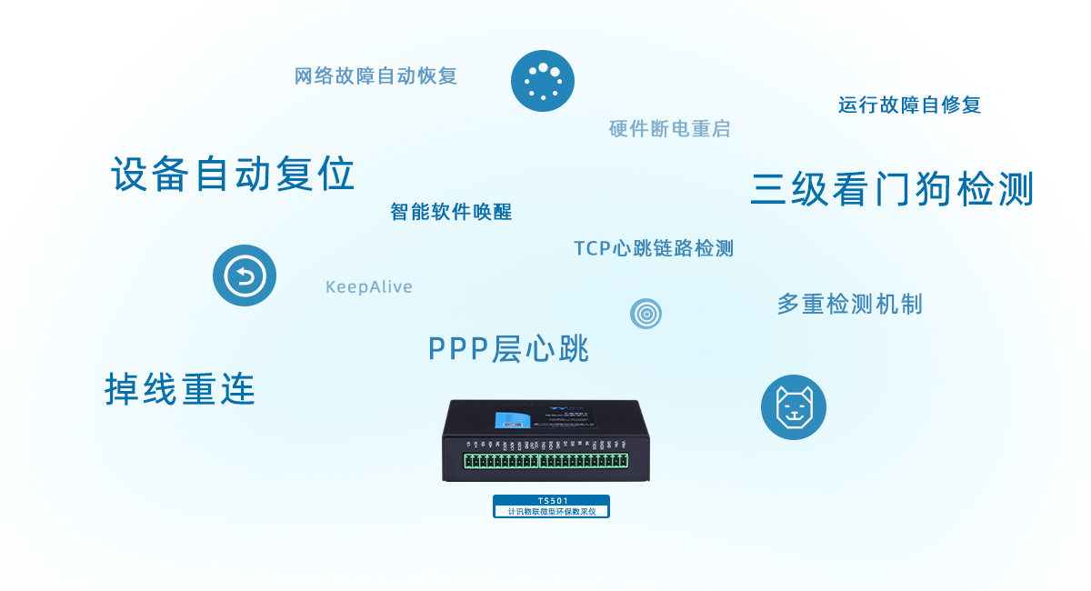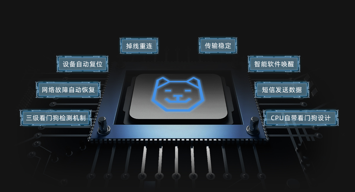 多重檢測機制,運行故障自修復;三級看門狗檢測機制,智能軟件喚醒和硬件斷電重啟機制,設備自動復位;采用PPP層心跳、KeepAlive、TCP心跳鏈路檢測機制、網絡故障自動恢復、掉線重連確保設備永久在線。
