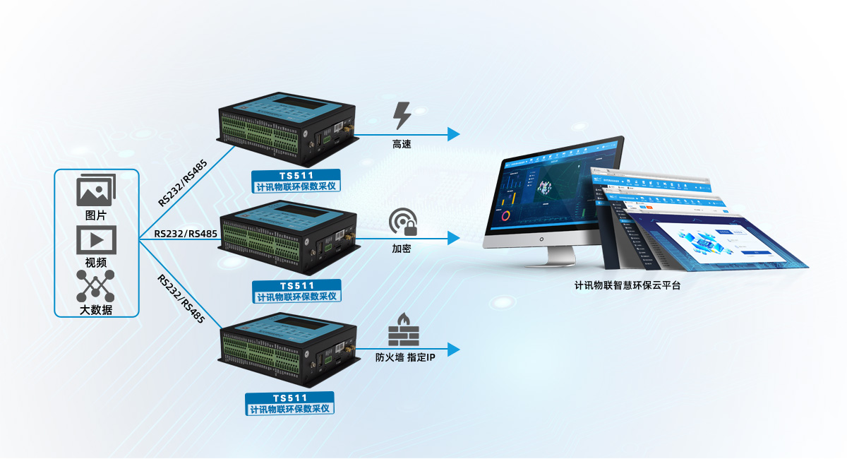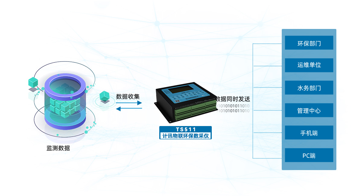 TS511環(huán)保數(shù)采儀,集視頻圖像監(jiān)控、數(shù)據(jù)采集、數(shù)據(jù)存儲、無線通信傳輸于一體;實(shí)現(xiàn)環(huán)保數(shù)據(jù)的采集、存儲、顯示、控制、報(bào)警及加密傳輸?shù)染C合功能;智能采集上報(bào)實(shí)時采集數(shù)據(jù)、設(shè)備監(jiān)控?cái)?shù)據(jù)等數(shù)據(jù)信息;接口豐富,可擴(kuò)展性強(qiáng)、功能強(qiáng)大,組網(wǎng)靈活。