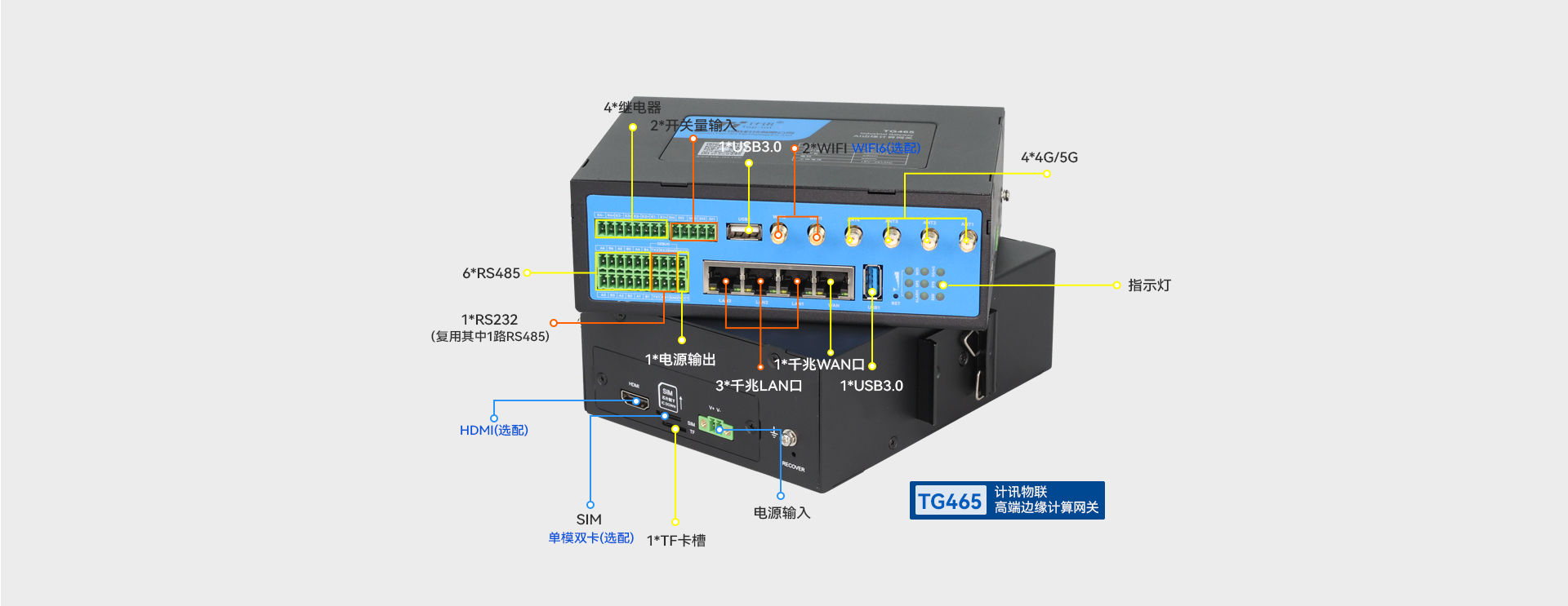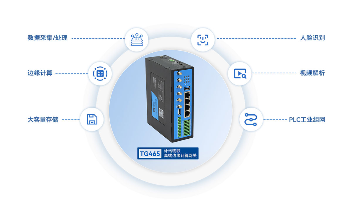 高性能AI智能網關 | TG465計訊物聯(lián)TG465高性能物聯(lián)網網關,5G+WIFI6高速網絡,四核64位Cortex-A55,2GRAM、16GFLASH,1TOPS NPU,主頻高達2GHZ,超強的運算能力,邊緣計算,國密加密,HDMI可選、固態(tài)硬盤NVMe SSD、單模雙卡可選。 -