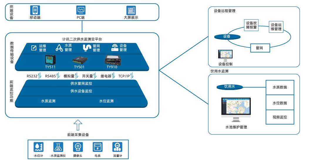 計(jì)訊物聯(lián)二次供水監(jiān)測系統(tǒng)專門針對(duì)設(shè)備、管網(wǎng)及水質(zhì)進(jìn)行監(jiān)測管理,可同時(shí)對(duì)不同類型的二次供水設(shè)備進(jìn)行監(jiān)測和統(tǒng)一管理。