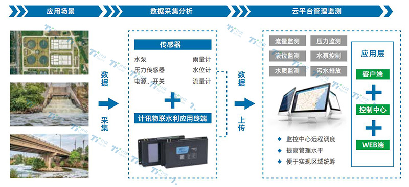 計訊物聯(lián)智慧排水應(yīng)用解決方案是由物聯(lián)感知層、數(shù)據(jù)采集分析層、應(yīng)用層三大結(jié)構(gòu)配套安防保障、運維管理、決策分析等組成。此方案通過計訊物聯(lián)水利遙測終端與水位計、流量計、雨量傳感器等設(shè)備的連接,實時監(jiān)測城市排水情況,并利用4G/5G等多種通訊方式進行數(shù)據(jù)的傳輸匯聚至計訊物聯(lián)應(yīng)用管理云平臺。